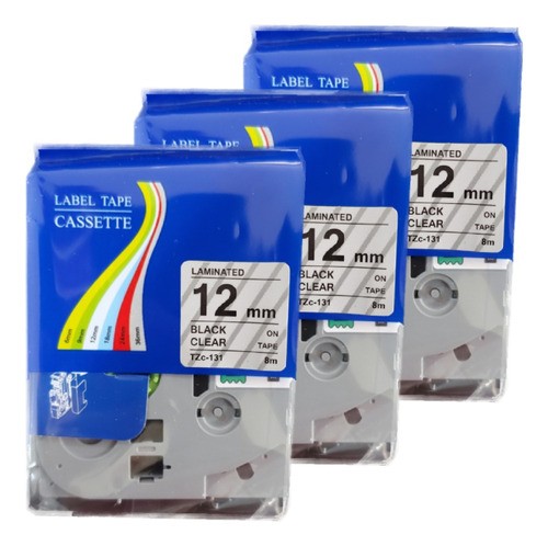 KIT DE 3 CINTAS DE ETIQUETAS COMPATIBLES 12MM NEGRO SOBRE TRANSPARENTE LAMINADAS Tze-131 Tze131 TZ Tze 131 Tz-131 Tz131 P-Touch