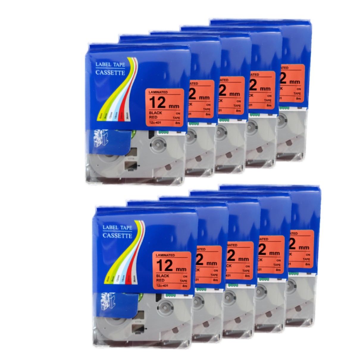 KIT DE 10 CINTAS DE ETIQUETAS COMPATIBLES 12MM NEGRO SOBRE ROJO LAMINADAS Tze-431 Tze431 TZ Tze 431 Tz-431 Tz431 P-Touch