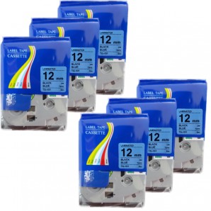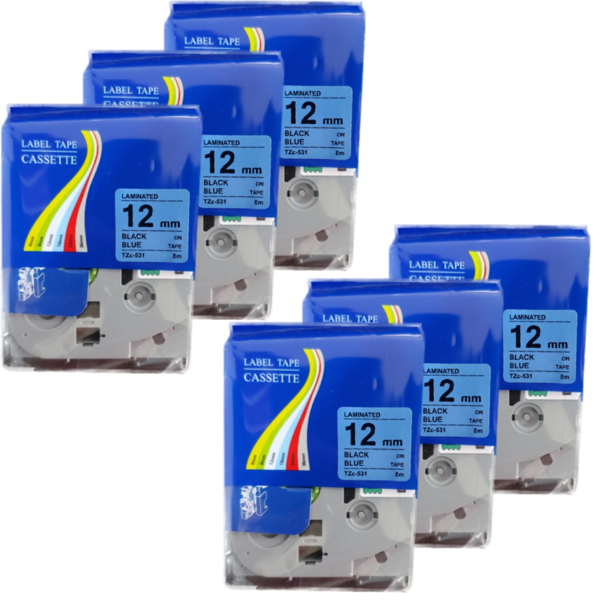 KIT DE 6 CINTAS DE ETIQUETAS COMPATIBLES 12MM NEGRO SOBRE AZUL LAMINADAS Tze-531 Tze531 TZ Tze 531 Tz-531 Tz531 P-Touch