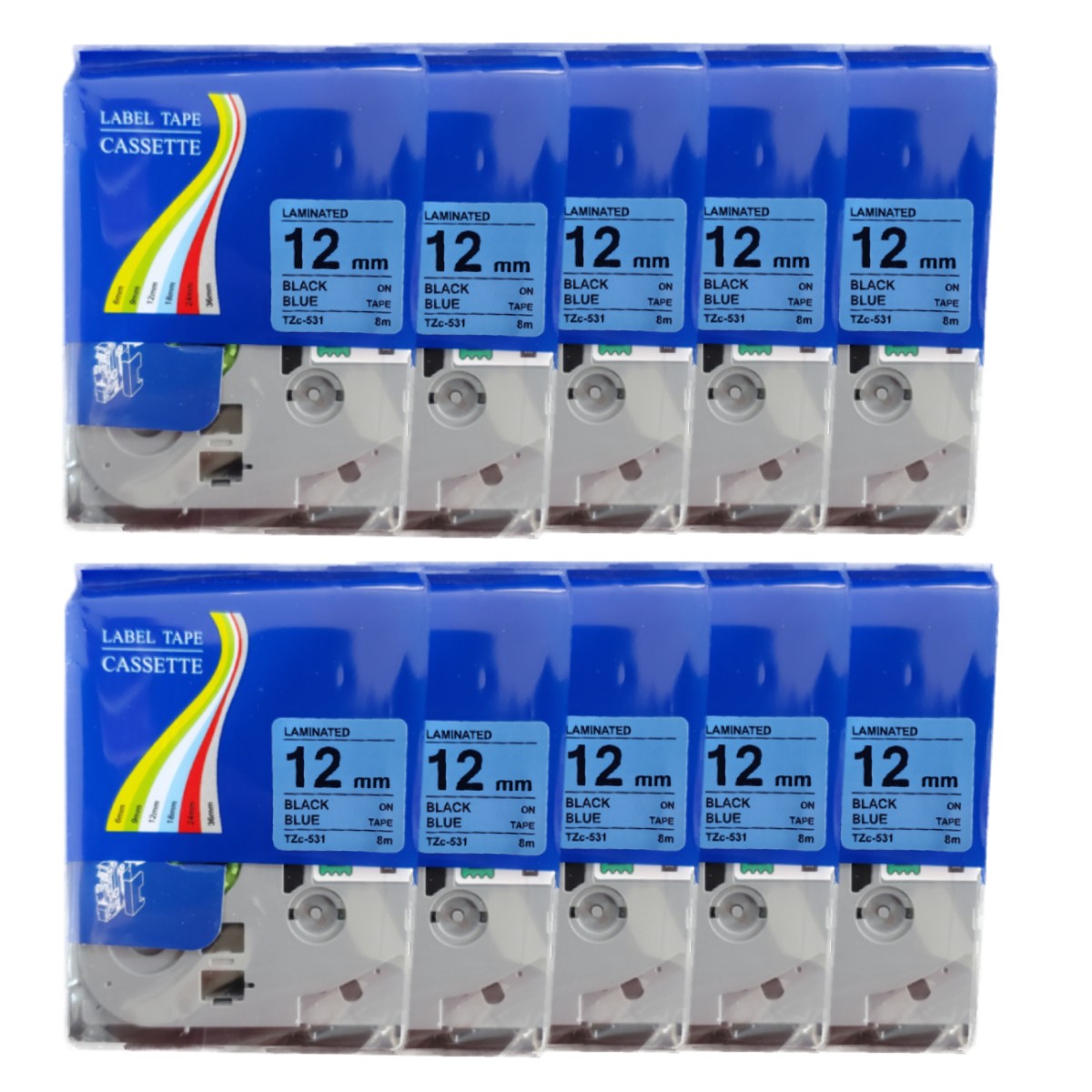 KIT DE 10 CINTAS DE ETIQUETAS COMPATIBLES 12MM NEGRO SOBRE AZUL LAMINADAS Tze-531 Tze531 TZ Tze 531 Tz-531 Tz531 P-Touch