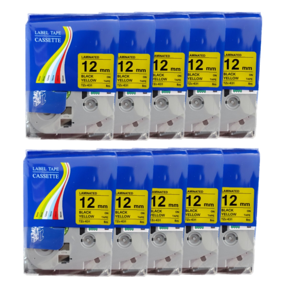 KIT DE 10 CINTAS DE ETIQUETAS COMPATIBLES 12MM NEGRO SOBRE AMARILLO LAMINADAS Tze-631 Tze631 TZ Tze 631 Tz-631 Tz631 P-Touch