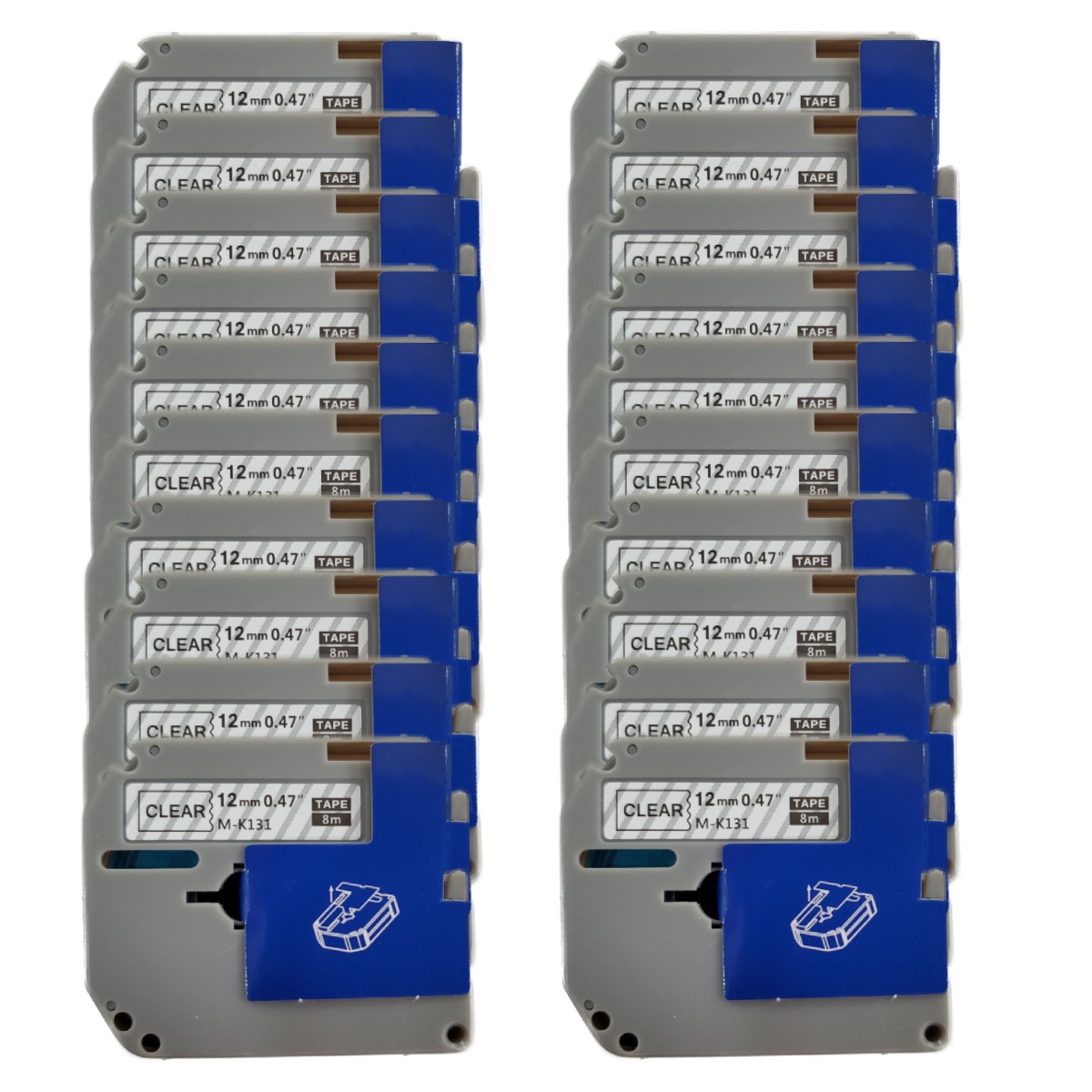 KIT 20 CINTAS DE ETIQUETAS COMPATIBLES 12MM NEGRO SOBRE TRANSPARENTE LAMINADAS M-K131 MK 131 MK131 P-Touch PARA BROTHER PT-55 PT-85