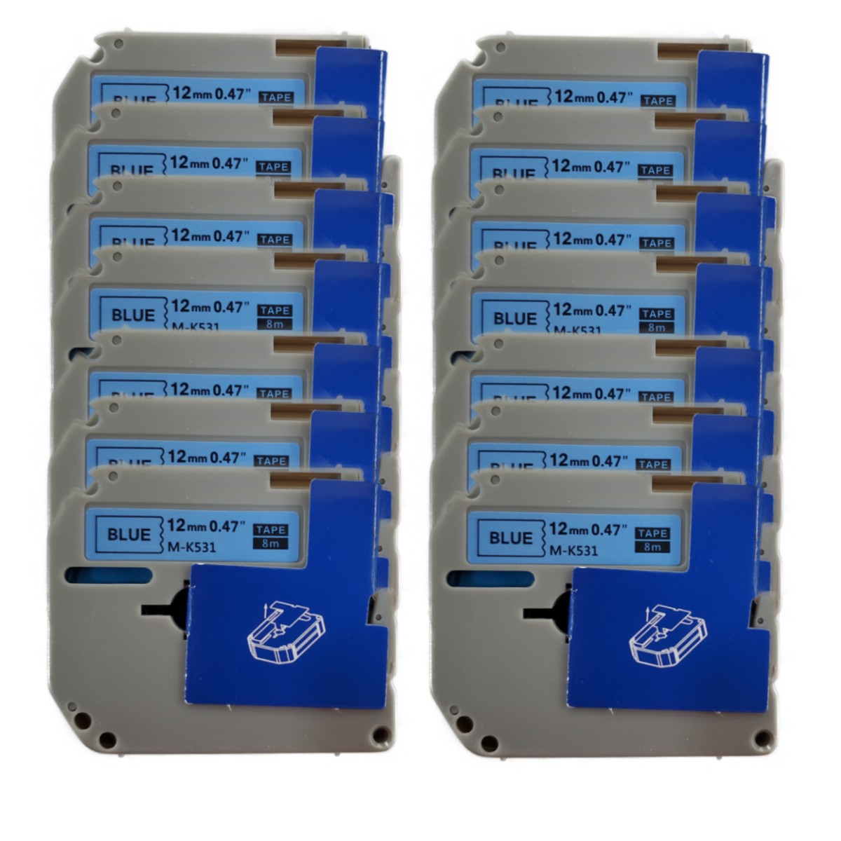 KIT 14 CINTAS DE ETIQUETAS COMPATIBLES 12MM NEGRO SOBRE AZUL LAMINADAS M-K531 MK 531 MK531 P-Touch PARA BROTHER PT-55 PT-85