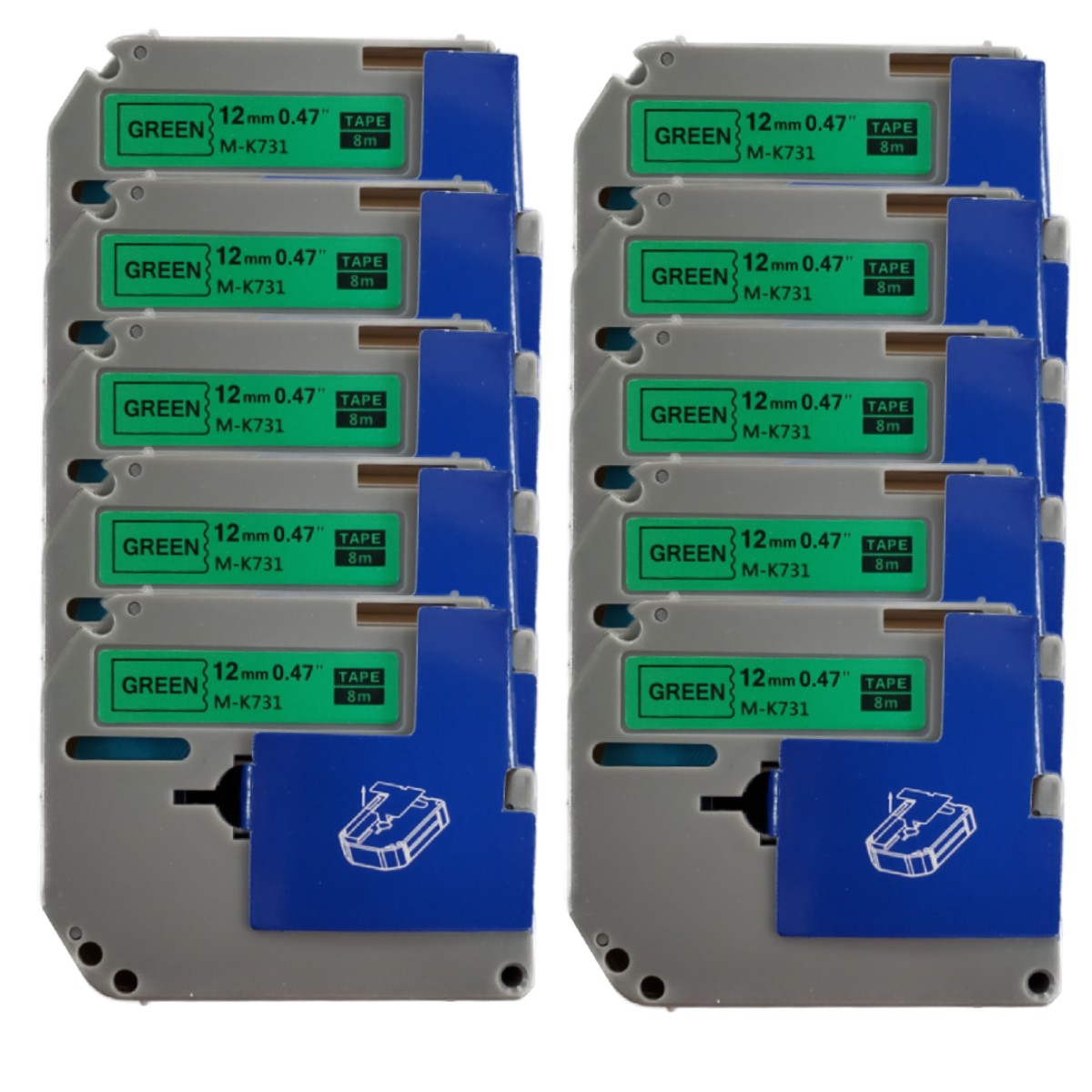 KIT 10 CINTAS DE ETIQUETAS COMPATIBLES 12MM NEGRO SOBRE VERDE LAMINADAS M-K731 MK 731 MK731 P-Touch PARA BROTHER PT-55 PT-85