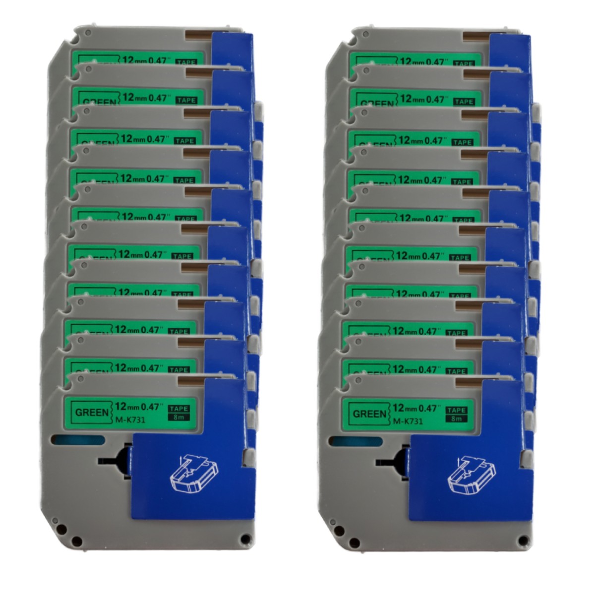 KIT 20 CINTAS DE ETIQUETAS COMPATIBLES 12MM NEGRO SOBRE VERDE LAMINADAS M-K731 MK 731 MK731 P-Touch PARA BROTHER PT-55 PT-85