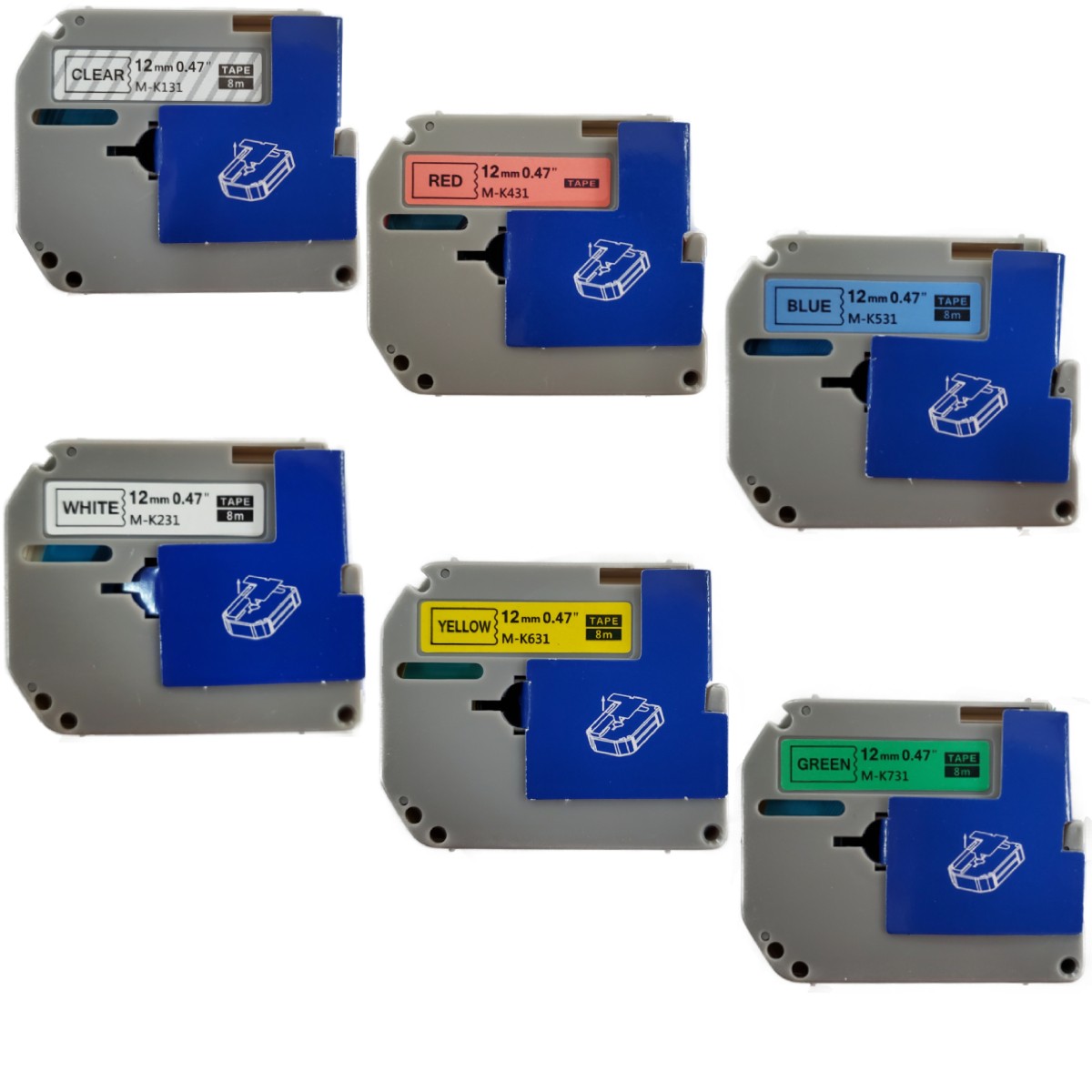KIT 6 COLORES CINTAS DE ETIQUETAS COMPATIBLES 12MM LAMINADAS M-K231 M-K431 M-K531 M-K631 M-K731 P-Touch PARA BROTHER PT-55 PT-85