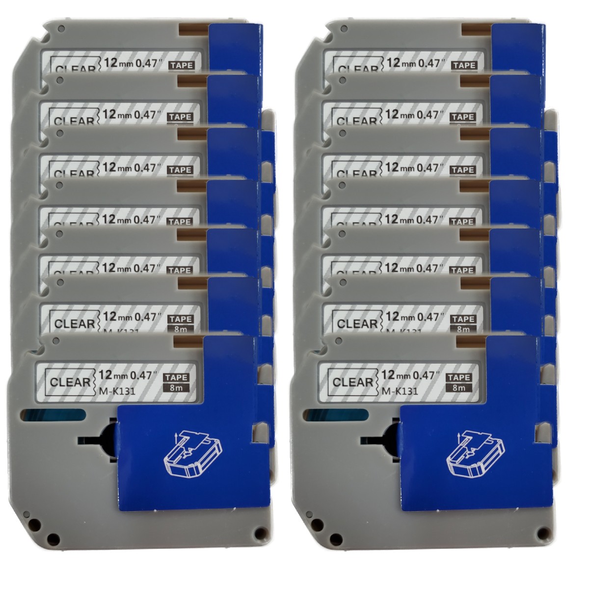 KIT 14 CINTAS DE ETIQUETAS COMPATIBLES 12MM NEGRO SOBRE TRANSPARENTE LAMINADAS M-K131 MK 131 MK131 P-Touch PARA BROTHER PT-55 PT-85