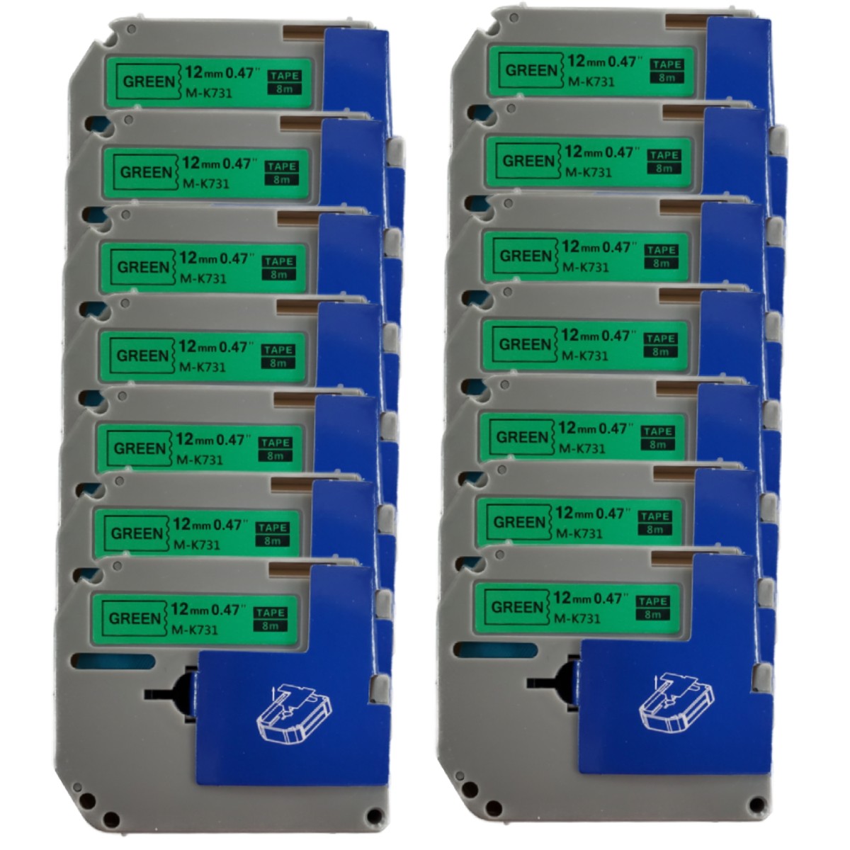 KIT 14 CINTAS DE ETIQUETAS COMPATIBLES 12MM NEGRO SOBRE VERDE LAMINADAS M-K731 MK 731 MK731 P-Touch PARA BROTHER PT-55 PT-85